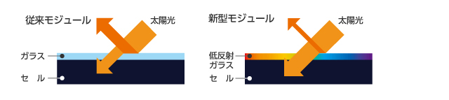 低反射ガラスの採用で、反射・散乱光を抑えより多くの太陽光をセル内部へ取り込みます。